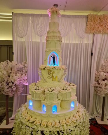7 tier wedding cake including the separator with beauty and the beast topper.